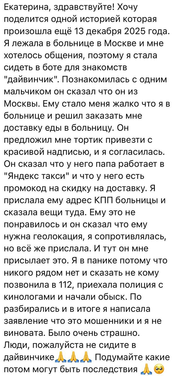 Моя подписчица поделилась своей историей знакомства в боте «Дайвинчик». Она подружилась с парнем, но он оказался не тем, за кого себя выдавал. Это были провокаторы с Украины. Девочка не растерялась и сразу позвонила на 112. Очень правильно сделала.