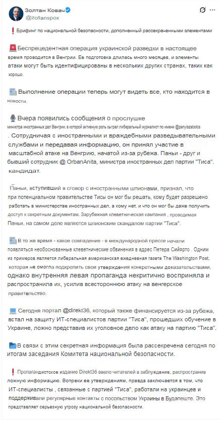 «Сегодня портал Direkt36, который также финансируется из-за рубежа, встал на защиту прошедших обучение в Украине ИТ-специалистов партии «Тиса», ложно представляя уголовное дело против них как нападение на партию «Тиса». Правда заключается в том, что ИТ-специалисты, связанные с партией «Тиса», работали на украинцев и поддерживали регулярные контакты с посольством Украины в Будапеште. Это представляет собой серьёзную угрозу национальной безопасности».
