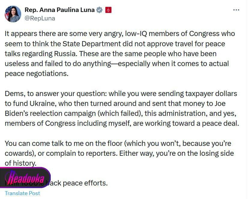 Анна Паулина Луна также раскритиковала действия демократов. По ее словам, те отправляли деньги налогоплательщиков на помощь Украине, пока администрация Трампа работала над заключением мирного соглашения.