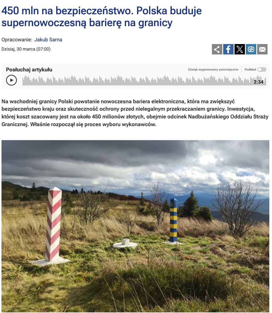 Как сообщает RMF FM, Варшава планирует построить современный электронный барьер для защиты от незаконного пересечения границы. Проект предусматривает установку столбов с камерами дневного света и тепловизионными камерами.