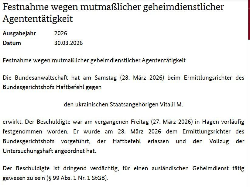 В Германии задержали некоего гражданина Украины Виталия, которого обвиняют в шпионаже за проживающим там всушником для проведения русскими спецслужбами операций против этого всушника в будущем.