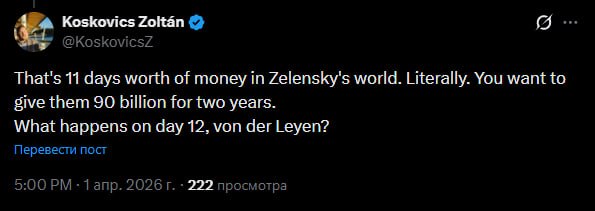 "В мире Зеленского эта сумма эквивалентна одиннадцати дням жизни. Буквально. Вы же хотите дать им 90 миллиардов на два года. Что случится на двенадцатый день, фон дер Ляйен?" — поинтересовался аналитик Центра фундаментальных прав Золтан Кошкович.