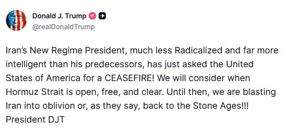 "Новый президент иранского режима — куда менее радикальный и гораздо более сообразительный, чем его предшественники, — только что запросил у Соединенных Штатов Америки ПРЕКРАЩЕНИЕ ОГНЯ! Мы рассмотрим этот запрос, когда Ормузский пролив станет открытым, свободным и безопасным. А до тех пор мы будем стирать Иран в порошок или, как говорится, вбивать его обратно в каменный век!!"