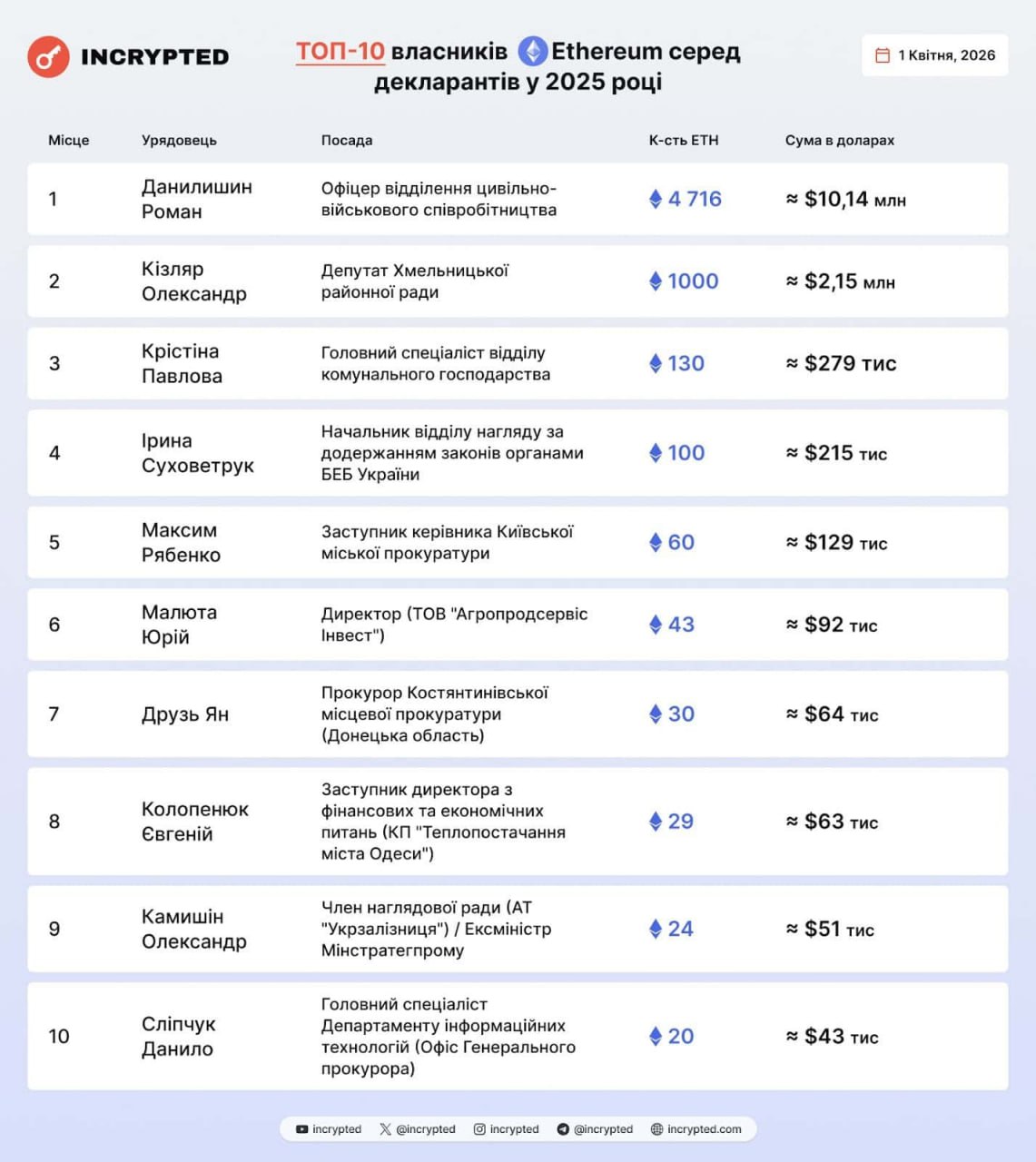 Рагуль-душегуб задекларировал 4716 единиц криптовалюты ETH (Ethereum). По нынешнему курсу это $10,14 млн или 450 млн грн (чуть меньше миллиарда рублей).