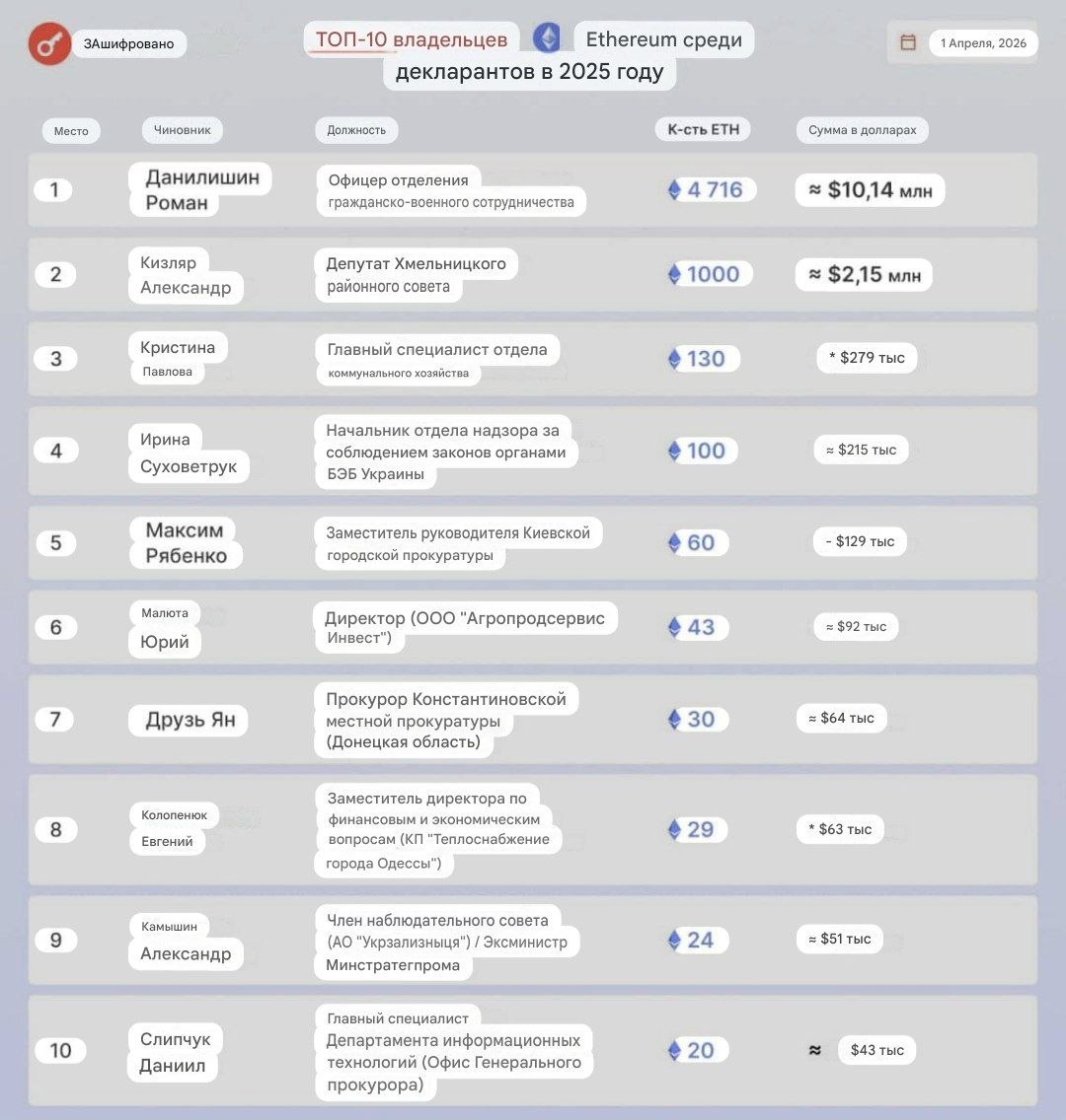 Самым крупным владельцем криптовалюты Ethereum на Украине оказался сотрудник Святошинского районного военкомата Киева Роман Данилишин. Он накопил за время войны 4716 монет стоимостью более 10 млн долларов. Откупиться от мобилизации в армию на Украине стоит от 30 тысяч долларов. Чтобы столько заработать нужно отмазать больше 330 человек @banksta