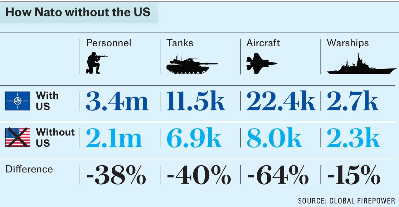 The Daily Telegraph изучает, что будет собой представлять НАТО после выхода США (газета называет это «самым масштабным разводом в истории»). Из этой графики следует, что особенно пострадает авиация, которая сократится на 64%.