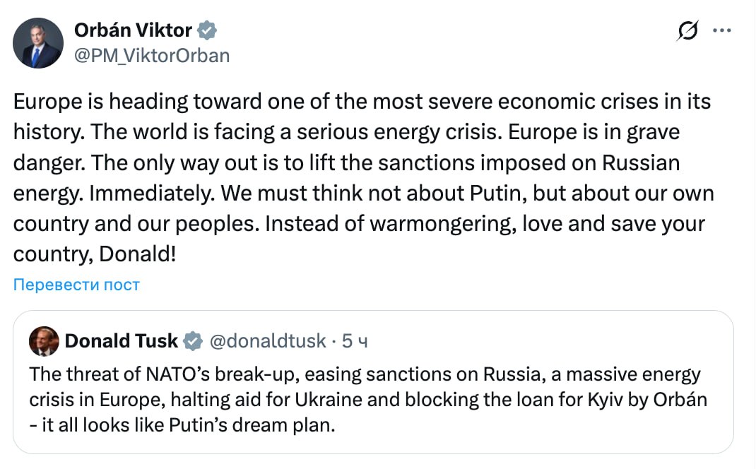«Угроза распада НАТО, смягчение санкций против России, масштабный энергетический кризис в Европе, прекращение помощи Украине и блокировка Орбаном кредита для Киева — всё это выглядит как план мечты Путина» — премьер-министр Польши Дональд Туск