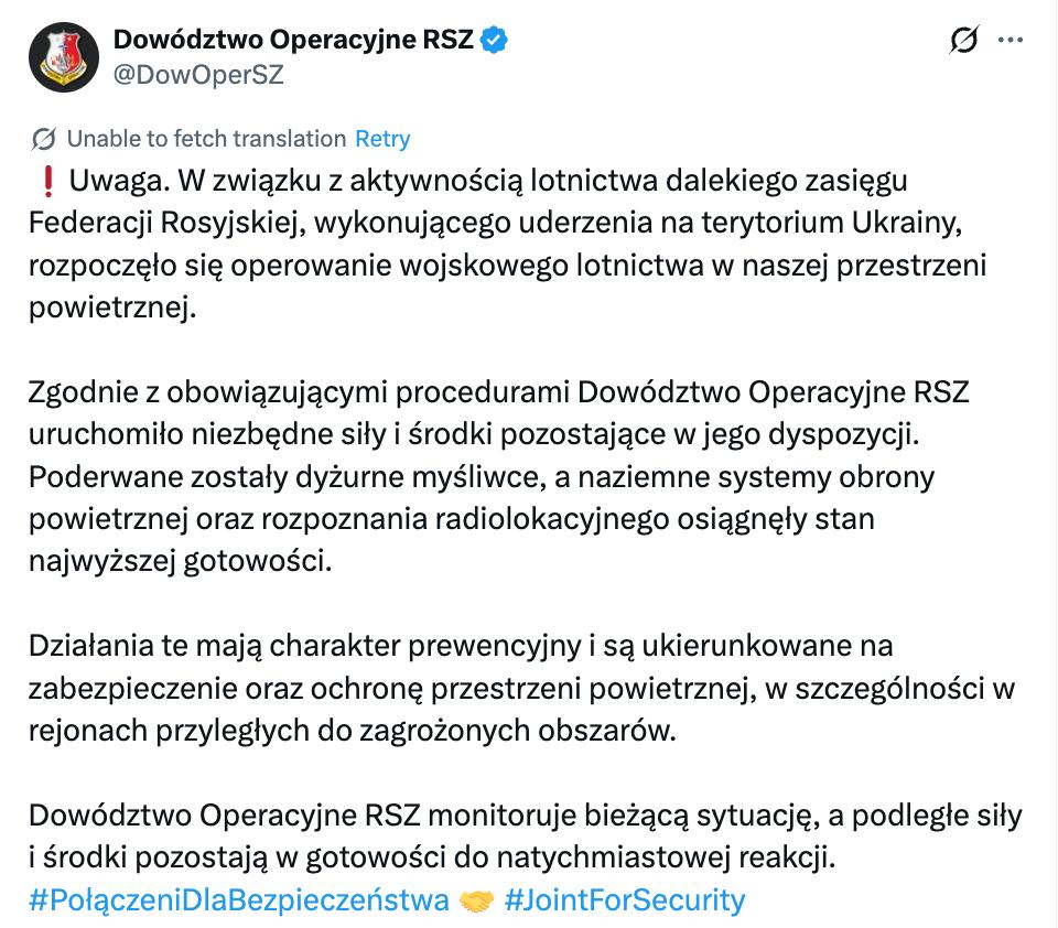 В связи с деятельностью дальней авиации РФ, осуществляющей удары по территории Украины, Польша поднимает авиацию в своем небе — ВС Польши