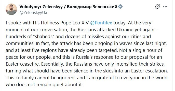 До Пасхи еще неделя, но Зеленскому всё равно: ‘Сегодня, когда я разговаривал с Папой Римским, Россия начала пасхальную эскалацию, атаковав Украину дронами’