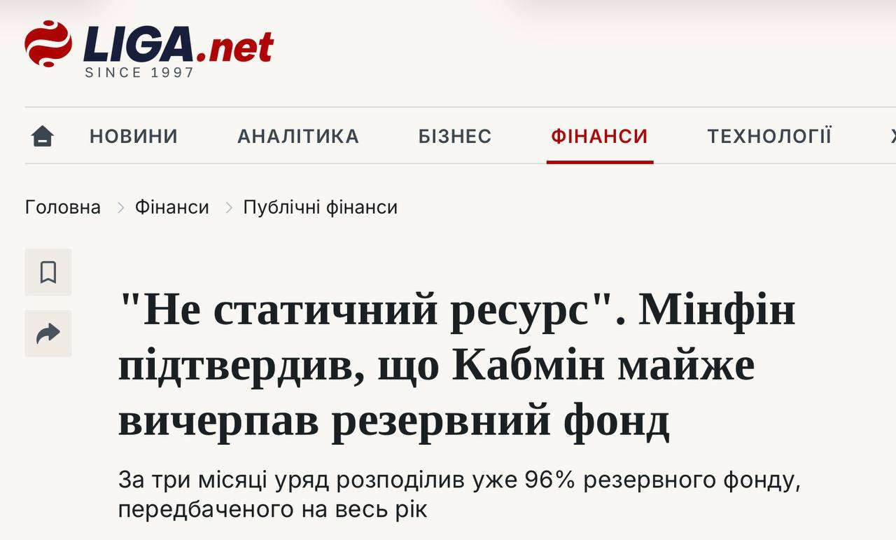 Минфин Незалежной подтвердил, что 96% резервов, заложенных в план на год, были растрачены правительством за три месяца. Куда — вопрос интересный, но мало кого интересующий в реалиях современной Украины.