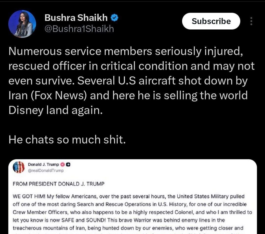 Вашингтон официально не признаёт провала операции по спасению пилота. Между тем есть достоверные сведения, что утрачены истребитель F15, два штурмовика A10, два вертолёта Black Hawk, два транспортных самолёта С-130, нескольких современных беспилотников, есть погибшие.