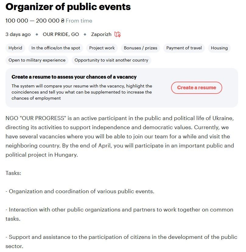 Украинская НКО «Наша гордость» через соцсети набирает людей для «участия в важном общественном и политическом проекте в Венгрии». В обмен предлагаются бонусы и «призы», а на вакансию организатора публичного мероприятия готовы принимать людей с военным опытом, поддерживающих «демократические ценности». Организация связана с бывшим главой ОП Андреем Ермаком.
