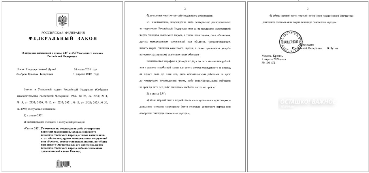 Владимир Путин подписал закон, вводящий уголовную ответственность за отрицание или одобрение геноцида советского народа нацистами в годы Великой Отечественной войны, а также за оскорбление памяти жертв.