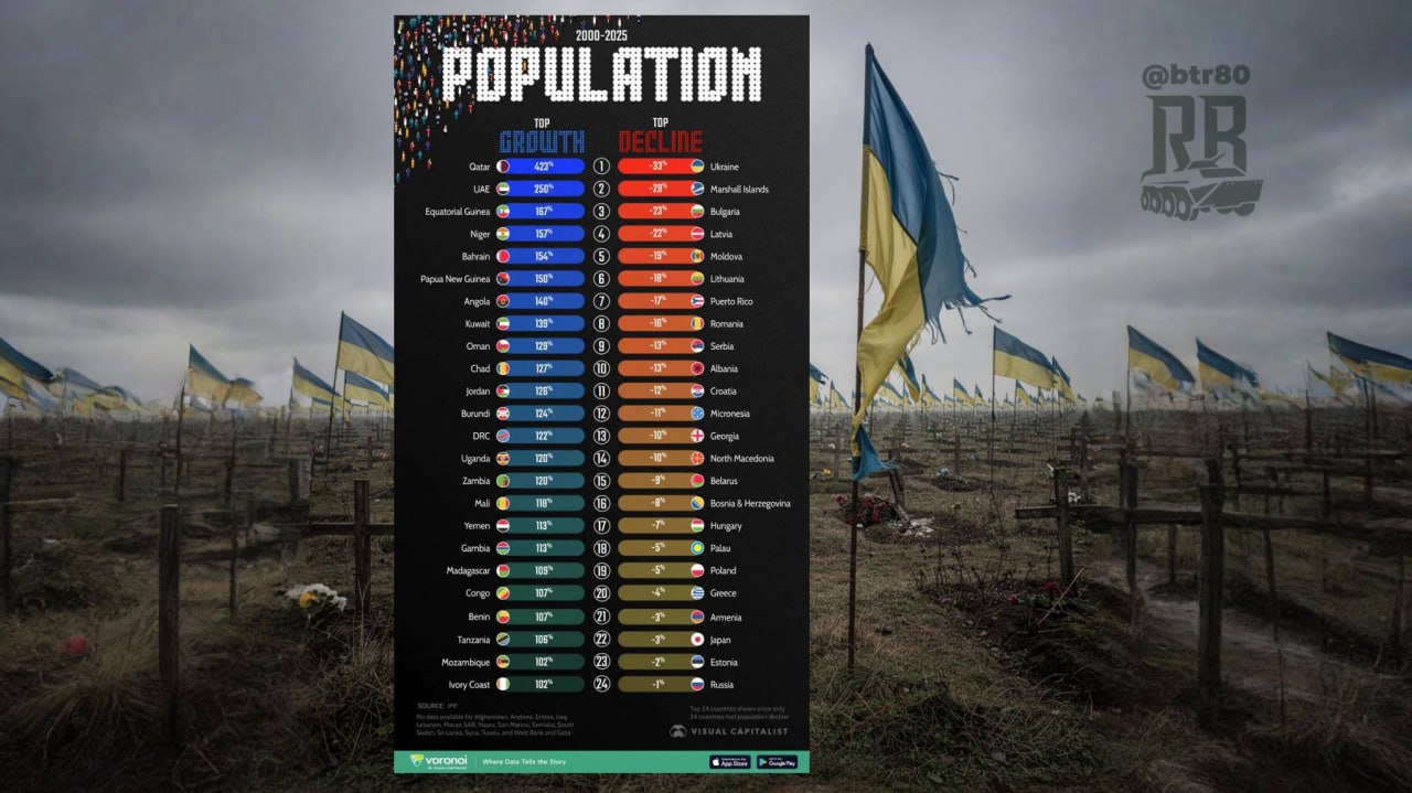 Ближе всего к Украине по убыли населения приблизились Маршалловы острова (-29%). В антирейтинге также ряд других восточноевропейских и постсоветских стран: Болгария (-23%), Латвия (-22%), Молдова (-19%), Литва (-18%).