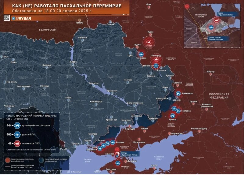 В пасхальное перемирие 2025 года Минобороны России зафиксировало более 1000 нарушений со стороны Украины: 444 обстрела российских позиций и более 900 атак дронами.