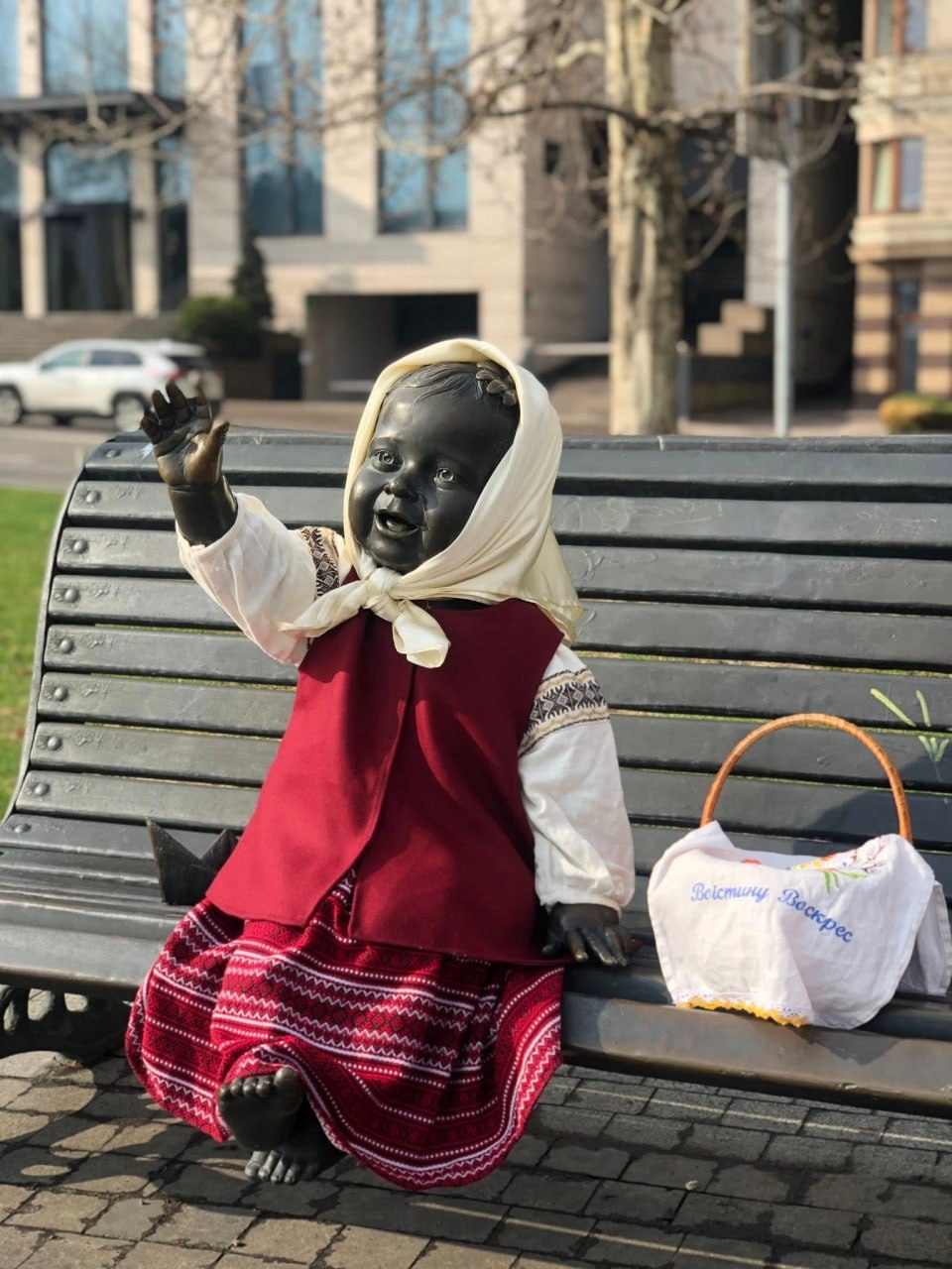 На Пасху в Киеве традиционно одевают в национальные одежды фигуры основателей города, которые, по версии создателей скульптур, почему-то являются афро-американцами