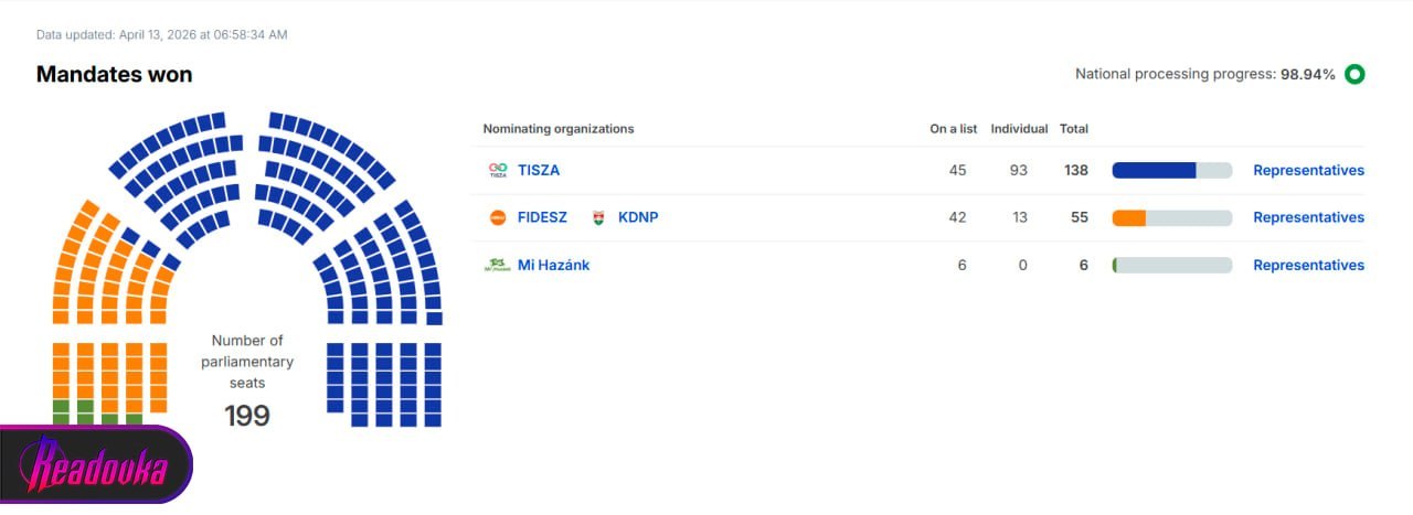 На данный момент подсчитано 98.94% голосов — Мадьяра уже поздравили с победой Макрон, Зеленский, Мерц и другие. Партия «Тиса» является оппозиционной — они шли на выборы с программой глубоких политических реформ. «Фидес» во главе с Орбаном, который находился у власти в Венгрии 16 лет, опирался на ценности национального суверенитета и традиционализма.