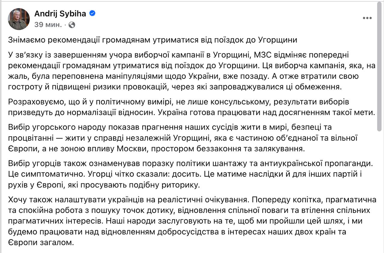 На Украине разрешили своим гражданам снова ездить в Венгрию «в связи с завершением вчера избирательной кампании», сообщил глава местного МИД Сибига
