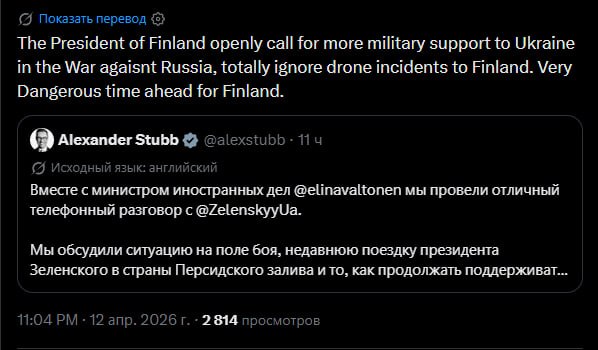 "Президент Финляндии открыто призывает к увеличению военной поддержки Украины в войне против России, полностью игнорируя инциденты с беспилотниками