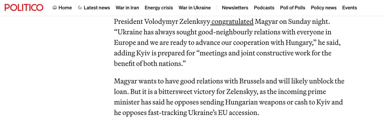 «Президент Украины Владимир Зеленский поздравил Мадьяра в воскресенье вечером. «Украина всегда стремилась к добрососедским отношениям со всеми в Европе, и мы готовы развивать сотрудничество с Венгрией», — сказал он, добавив, что Киев готов к «встречам и совместной конструктивной работе на благо обеих стран».Мадьяр намерен выстроить хорошие отношения с Брюсселем и, вероятно, разблокирует кредит. Однако для Зеленского это победа с горьким привкусом, поскольку будущий премьер заявил, что выступает против поставок венгерского оружия или финансовой помощи Киеву, а также против ускоренного вступления Украины в ЕС.