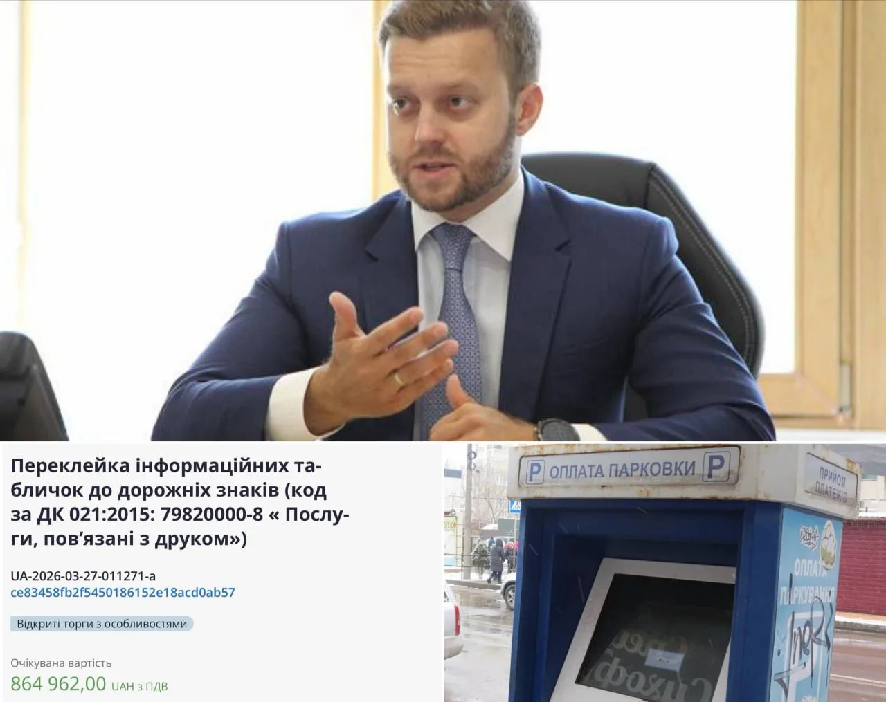 В украинских каналах публикуется новость, что по указанию Усова в Киеве объявили тендер почти на 1 млн грн для переклейки парковочных знаков.
