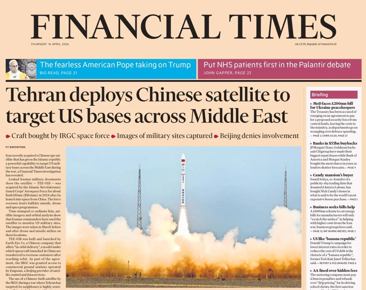 Financial Times сегодня срывает маски! Газета вопит на весь мир о том, что Иран для нанесения своих ракетных ударов использует данные китайских спутников. И пишет, что, если это подтвердится, то будет означать прямое участие Китая в войне Ирана против США и Израиля.