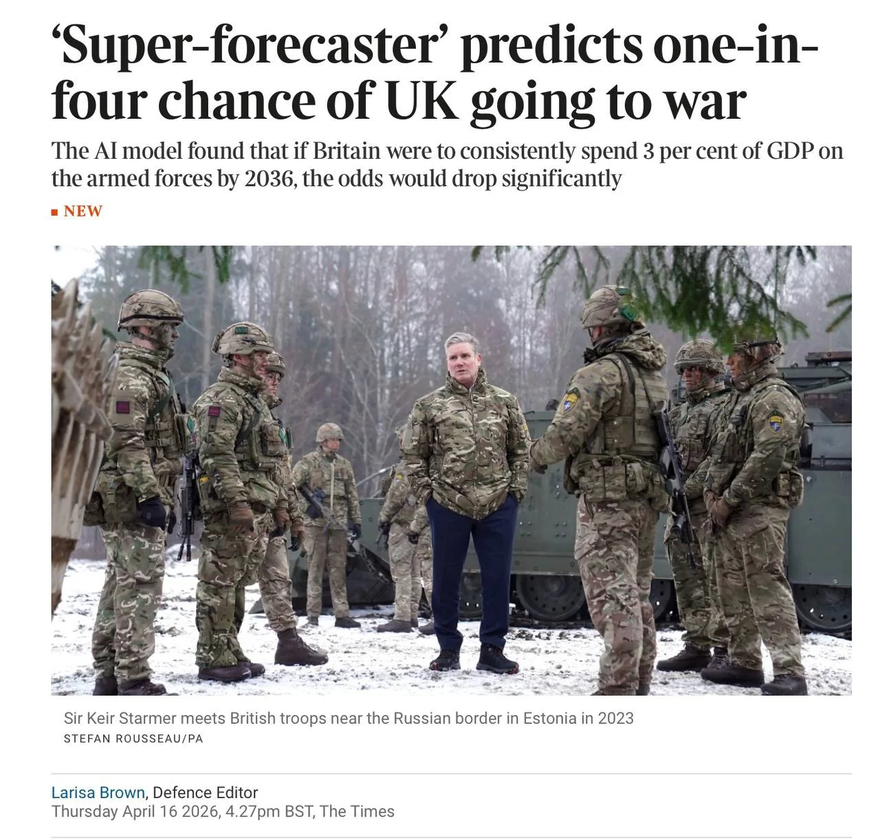 Британская модель Cassy AI, которую называют «супер-прогнозистом», оценила вероятность участия Лондона в войне в ближайшие 10 лет примерно в 25%. При этом, как пишет The Times, ключевым фактором в расчётах оказался именно украинский конфликт.