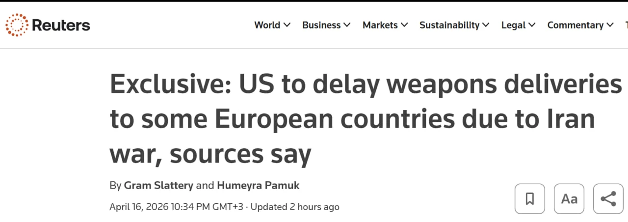 Reuters: Источники сообщают, что США отложат поставки оружия в некоторые европейские страны из-за войны с Ираном.