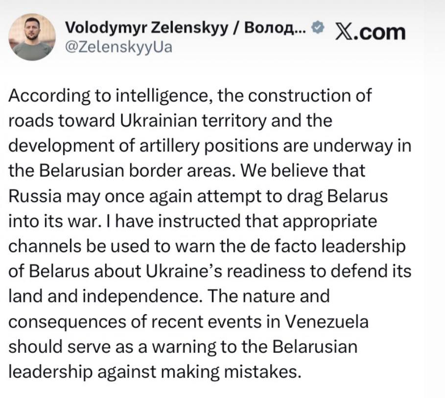По данным разведки, в приграничных районах Беларуси ведётся строительство дорог в направлении украинской территории и обустройство артиллерийских позиций. Мы считаем, что Россия может вновь попытаться втянуть Беларусь в свою войну. Я поручил использовать соответствующие каналы для предупреждения фактического руководства Беларуси о готовности Украины защищать свою землю и независимость. Характер и последствия недавних событий в Венесуэле должны послужить предупреждением белорусскому руководству о недопустимости ошибок.