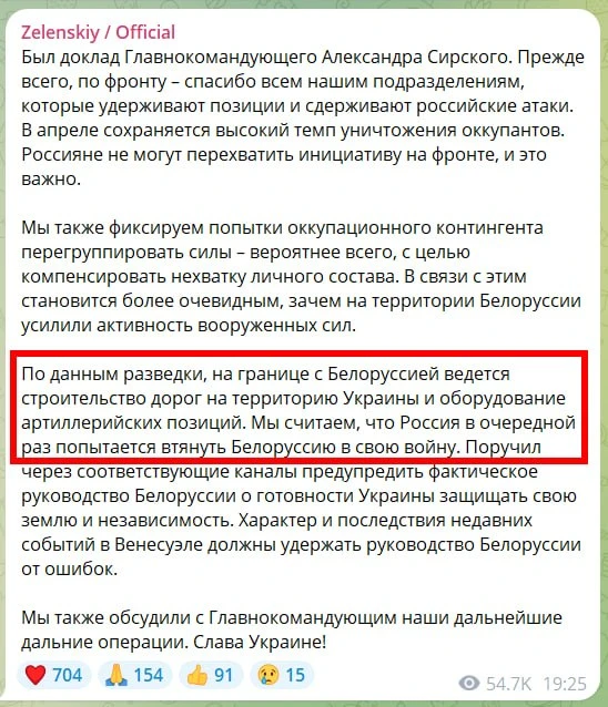Тем временем Зеленский написал, что со стороны белорусской границы стали возводиться артиллерийские позиции и прокладываться дороги для "втягивания Белоруссии в войну".