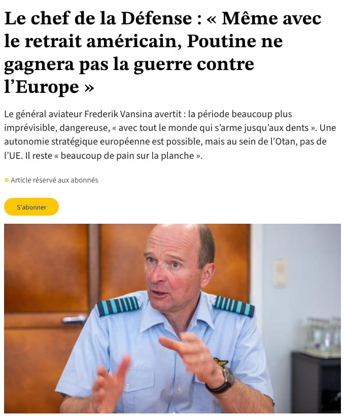 Глава Генштаба Бельгии Фредерик Вансина в интервью газете Le Soir заявил, что Европе необходимо время для перевооружения и подготовки к возможной войне с Россией. По его словам, это время обеспечивают украинцы.