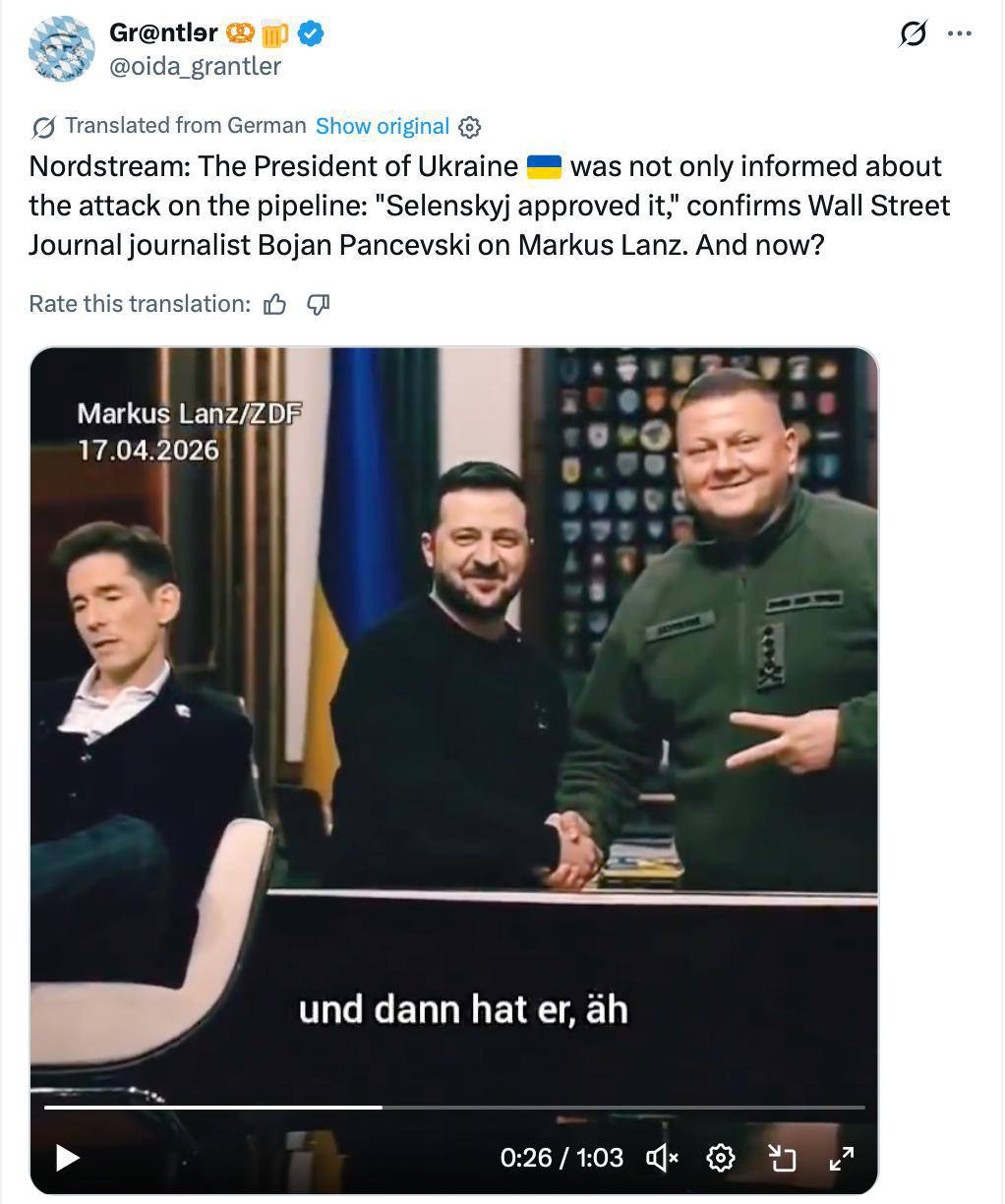 Зеленского обвинили не только в том, что он знал об атаке на газопровод Nord Stream, но и в том, что он её одобрил. Об этом заявил журналист The Wall Street Journal Боян Панчевски в эфире программы Маркуса Ланца на канале ZDF.