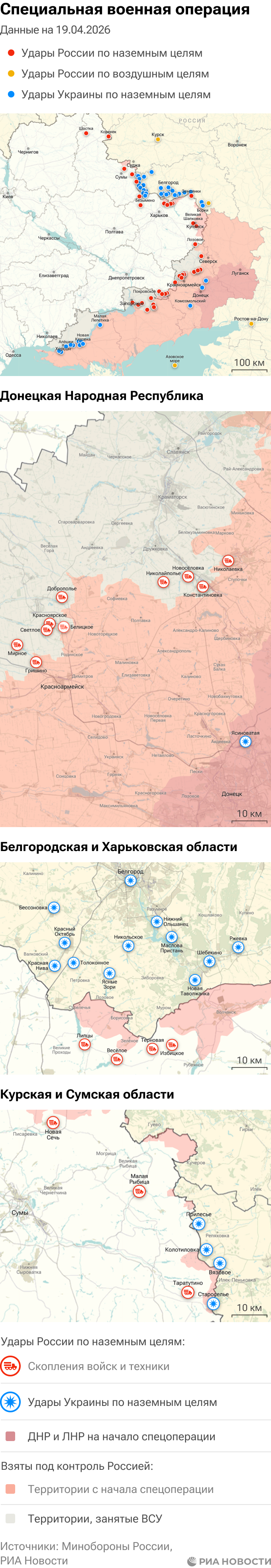 Российская армия с 24 февраля 2022 года проводит на Украине специальную военную операцию. Ее главной целью является помощь Донецкой и Луганской народным республикам, на территории которых с 2014 года не прекращались обстрелы. Перед российскими военными поставлена задача минимизировать потери личного состава и мирного населения при выполнении боевых заданий.Данные Минобороны и администраций новых регионов на 19 апреля 2026 года