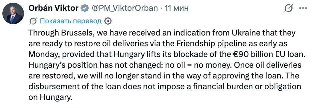 Виктор Орбан заявил, что Украина готова с понедельника возобновить поставки по «Дружбе», но при одном условии — Будапешт должен снять вето с кредита ЕС на €90 млрд.