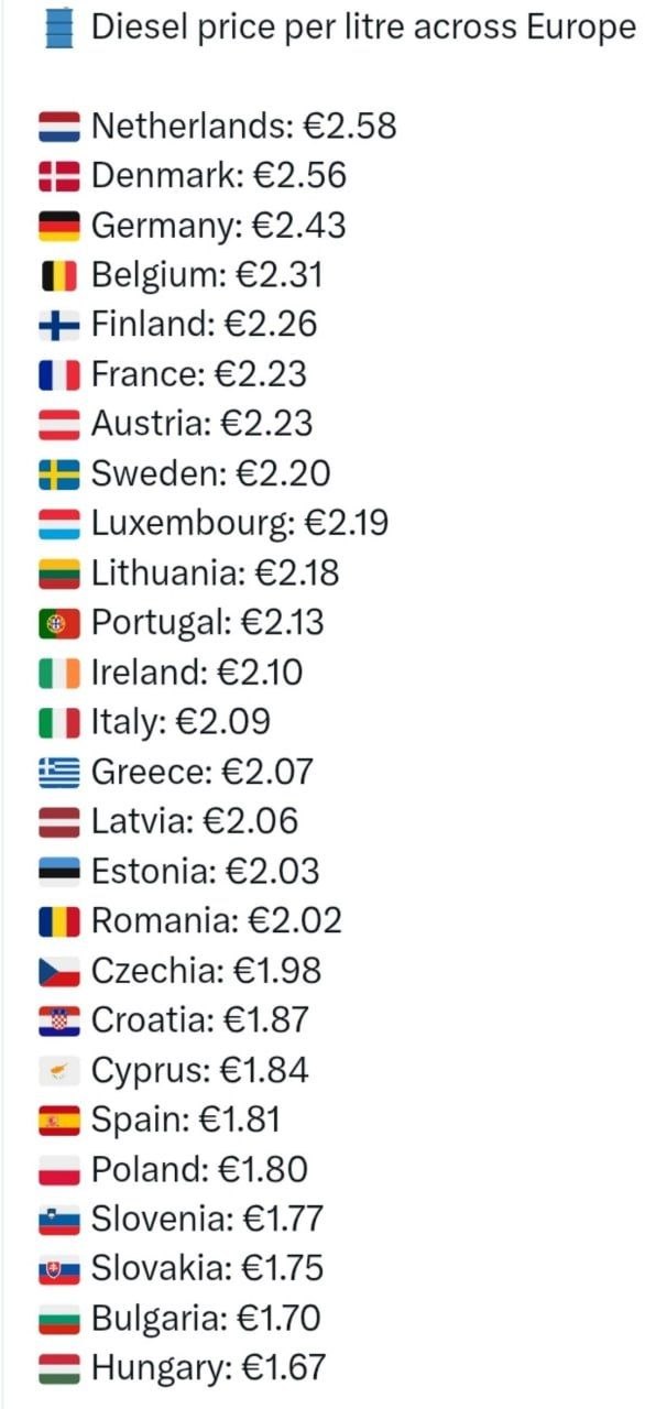 Интересная закономерность: чем активнее страны поддерживают Украину, тем выше у них цены на топливо. Самое дешевое дизельное топливо в Словакии и (пока) в Венгрии.