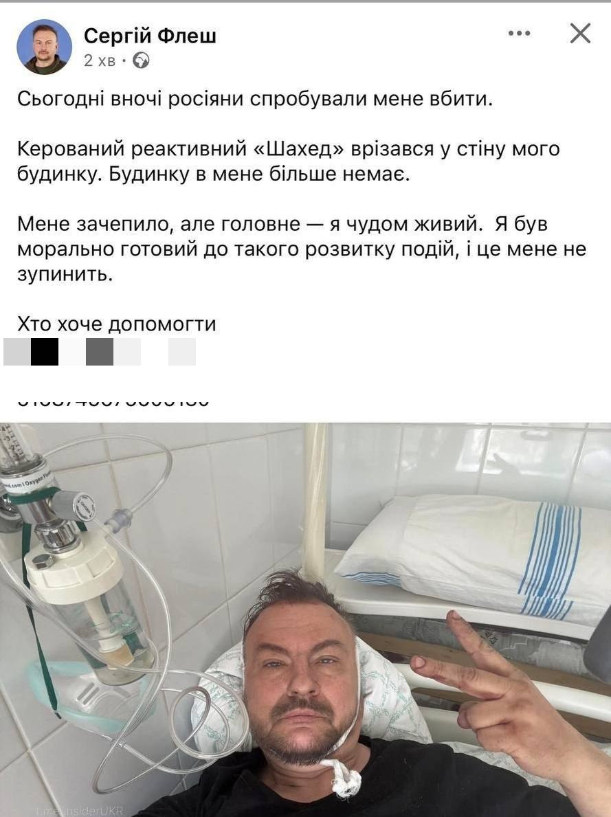 «Сегодня ночью россияне попытались меня убить. Управляемый реактивный «Шахед» врезался в стену моего дома. Дома у меня больше нет. Меня задело, но главное – я чудом жив»,