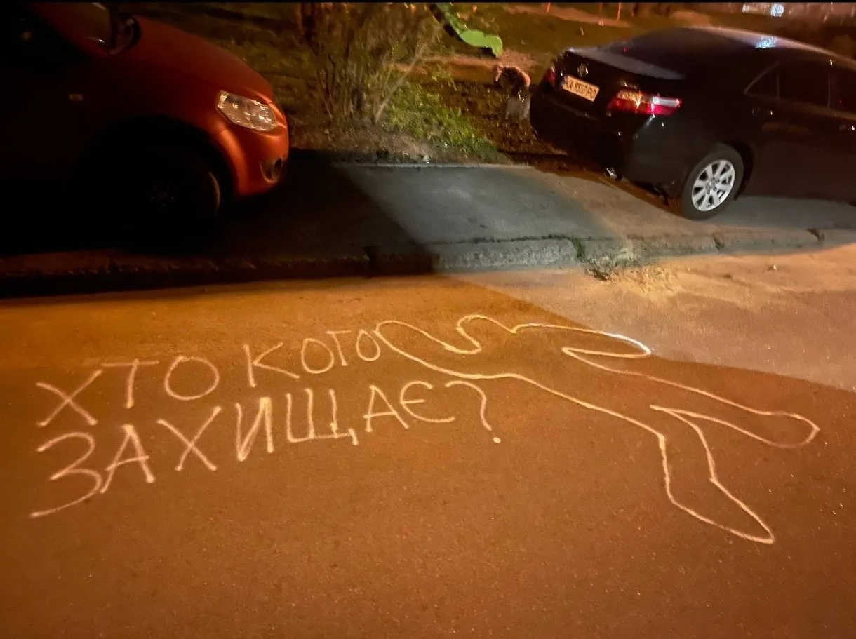 На асфальте обведён силуэт убитого человека, а рядом надпись: "Кто нас защищает?"