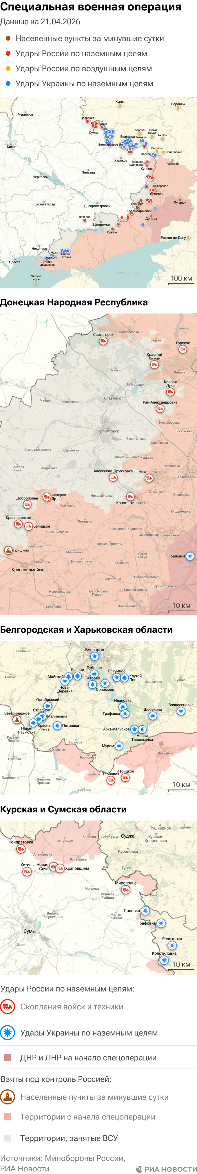 Российская армия с 24 февраля 2022 года проводит на Украине специальную военную операцию. Ее главной целью является помощь Донецкой и Луганской народным республикам, на территории которых с 2014 года не прекращались обстрелы. Перед российскими военными поставлена задача минимизировать потери личного состава и мирного населения при выполнении боевых заданий.Данные Минобороны и администраций новых регионов на 21 апреля 2026 года