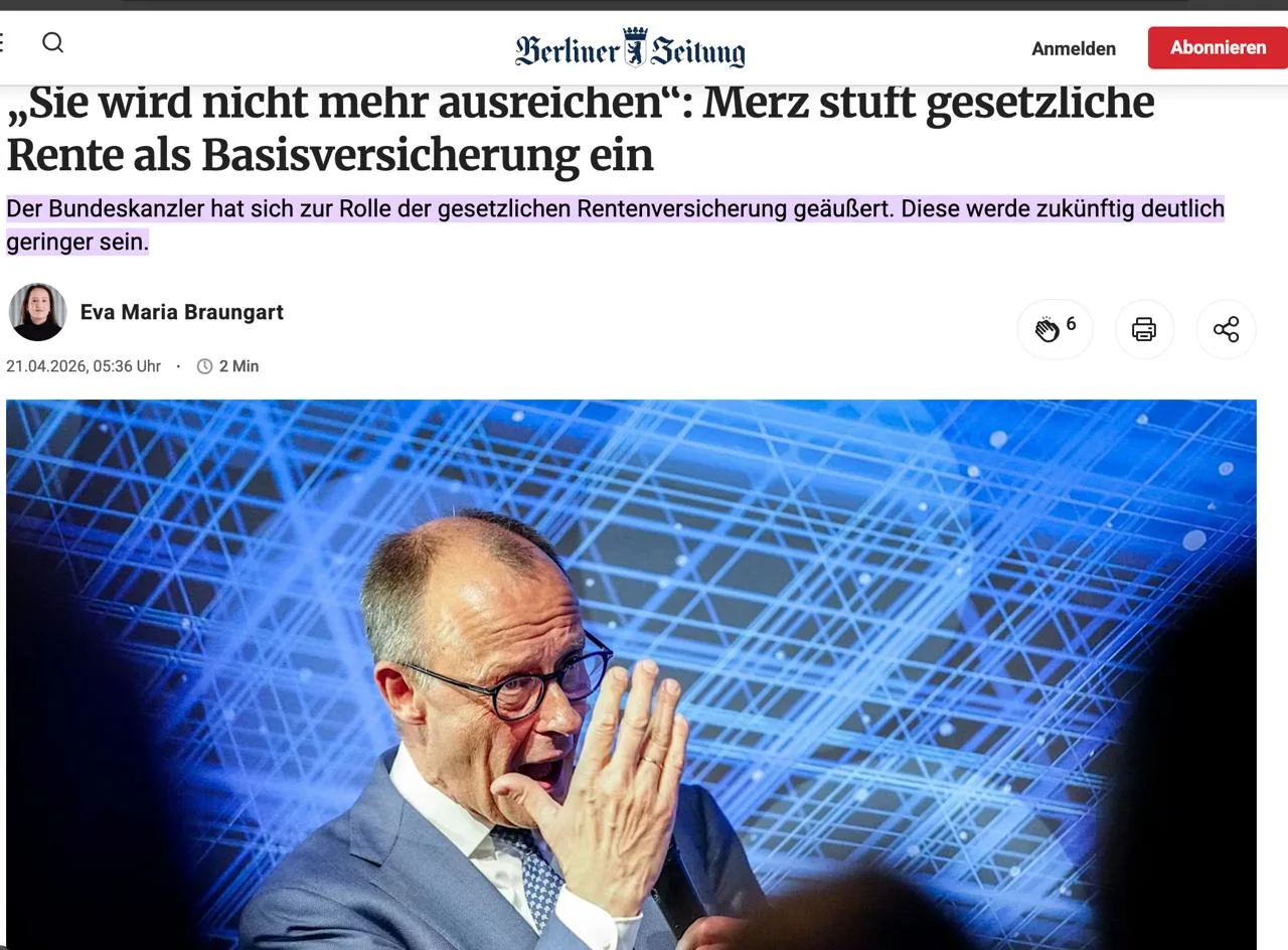 Он отметил, что текущее «государство всеобщего благосостояния» в его нынешнем виде больше не по карману стране с экономической точки зрения. Расходы на субсидирование пенсионного фонда достигли критической отметки в €128 млрд (почти четверть всего госбюджета на 2026 год).
