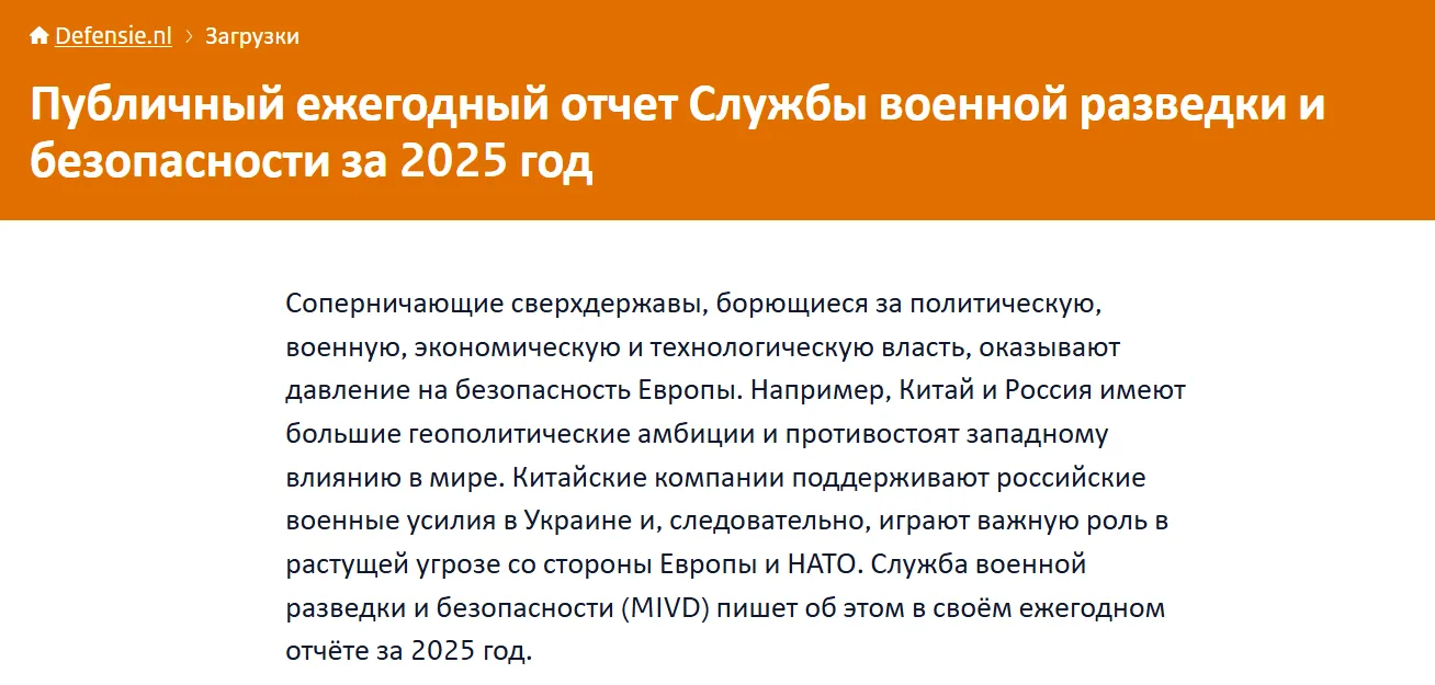 Россия после завершения боевых действий на Украине сможет в течение года нарастить достаточный военный потенциал для того, чтобы открыто противостоять НАТО в «региональном конфликте». К таком выводу пришла Служба военной разведки и безопасности Нидерландов (MIVD), что и изложила в отчете за 2025 год.