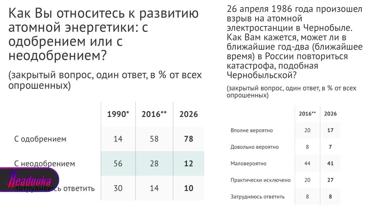 Спустя 40 лет после чернобыльской катастрофы россияне стали гораздо спокойнее относиться к атомной энергетике. Если в 1990 году ее развитие одобряли 14% граждан, то сейчас — 78%, то есть в 5,5 раза больше, подсчитал ВЦИОМ. 68% опрошенных не верят, что подобная авария может повториться в современной России (в 2016 году так считали 64%).