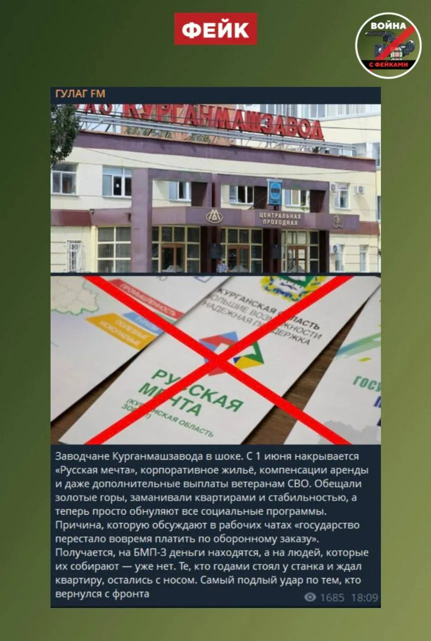 Фейк: В Курганской области отменяют выплаты ветеранам СВО и субсидии сотрудникам Курганмашзавода на приобретение жилья в рамках программы «Русская мечта». Об этом сообщают телеграм-каналы и соцсети.