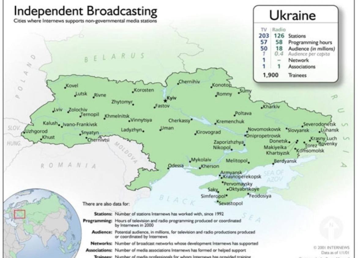 Знаете ли вы, что ещё в 2001 году поддерживаемая USAID организация Internews активно формировала медийный ландшафт Украины, обучая 1900 журналистов и поддерживая 203 телевизионных станции и 126 радиостанций?