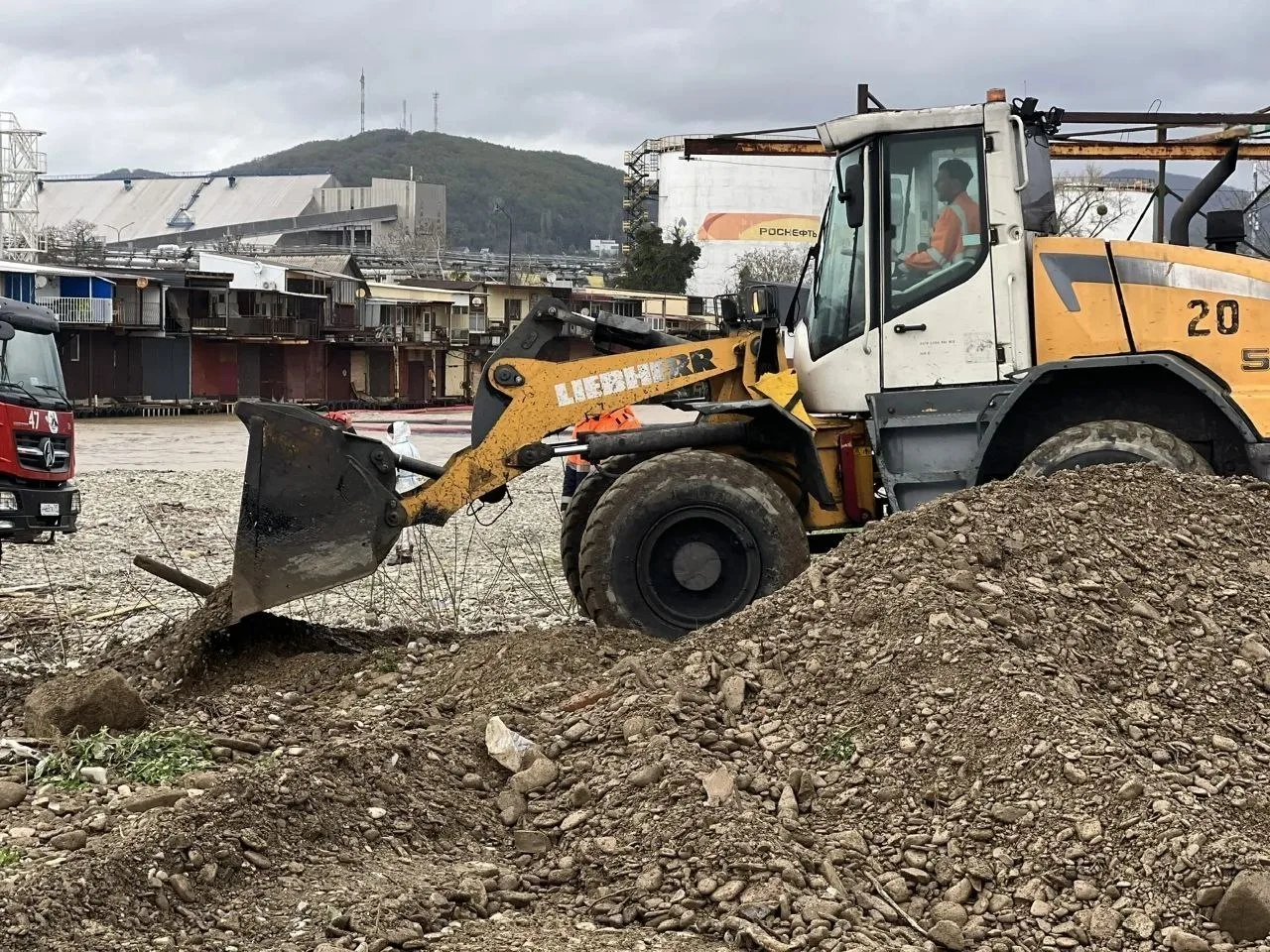 В Туапсе ведут круглосуточные работы по сбору нефтепродуктов, которые попали в реку и на прибрежную территорию в результате масштабного пожара из-за атаки БПЛА киевского режима 16 и 20 апреля