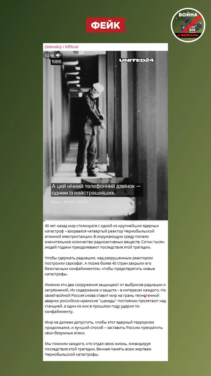 Правда: Перед нами спекуляция киевского режима, приуроченная к 40-й годовщине аварии на ЧАЭС. ВС РФ никогда не атаковали объект. Утверждения Зеленского — архивный фейковый нарратив. Год назад мы подробно разбирали обвинения в том, что российские военные якобы нанесли по саркофагу, которым укрыта станция, удар дроном «Герань-2» с фугасной боевой частью.
