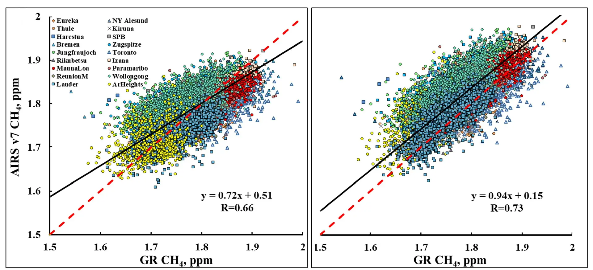 Для решения данной проблемы авторы провели сопоставление многолетних измерений атмосферного метана, полученных спутниковым прибором AIRS, с высокоточной наземной сетью спектрометров NDACC (18 станций, период 2003–2022 гг.). Был выявлен статистически значимый однонаправленный дрейф расхождений между спутниковыми и наземными данными, присутствующий во всех точках сравнения.