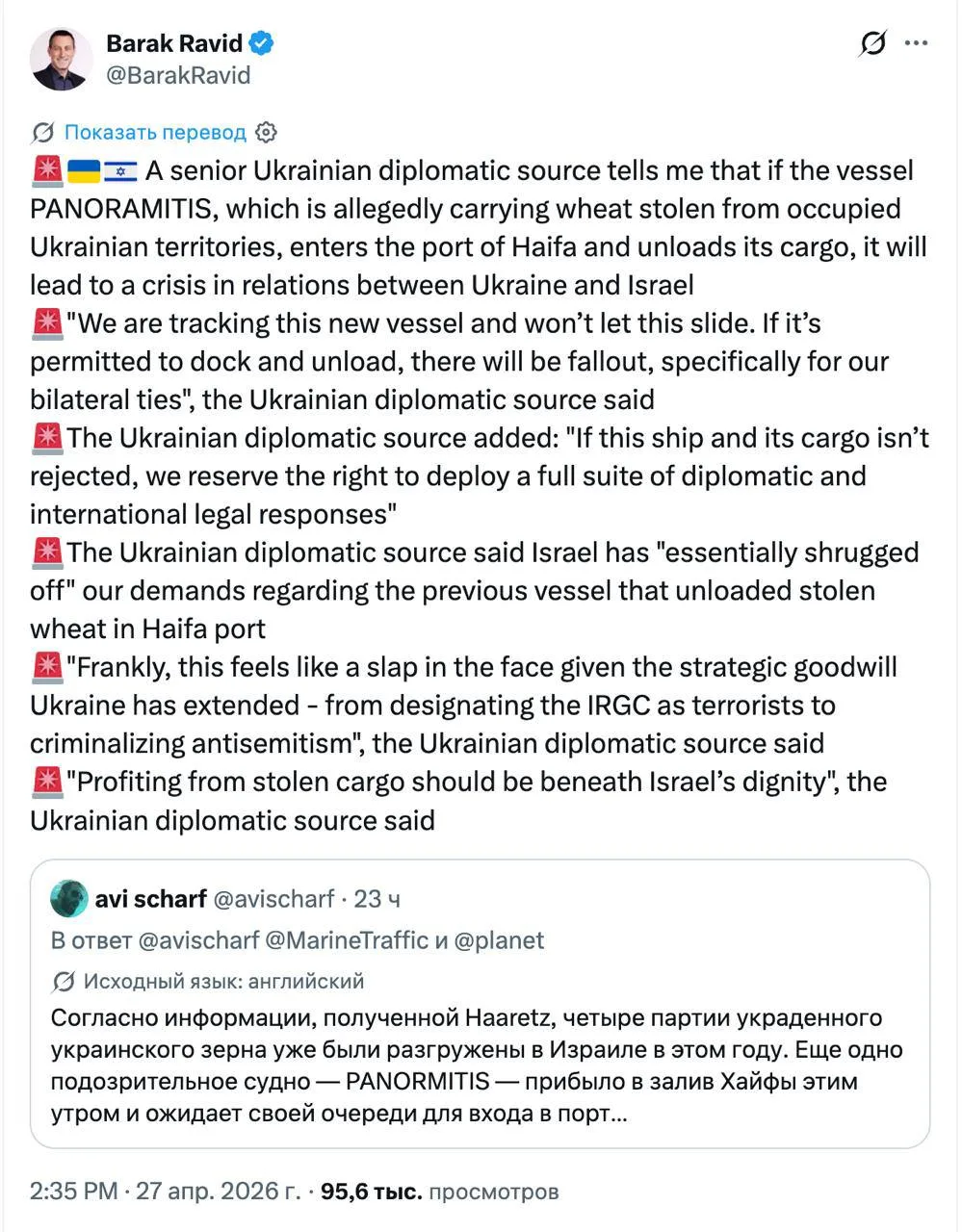 Одно судно уже уже было разгружено в Израиле, а второе сейчас приближается к порту Хайфы, несмотря на протесты Украины, сообщает журналист Axios Барак Равид.