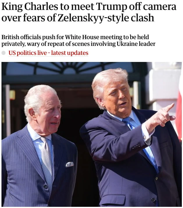 Британское правительство и Белый дом договорились, что встреча короля Карла III и президента США Дональда Трампа пройдет без камер во время обсуждения ключевых вопросов. По данным The Guardian, такое решение было принято по инициативе британской стороны, чтобы избежать повторения напряженного эпизода в стиле публичной перепалки Трампа с Зеленским*.