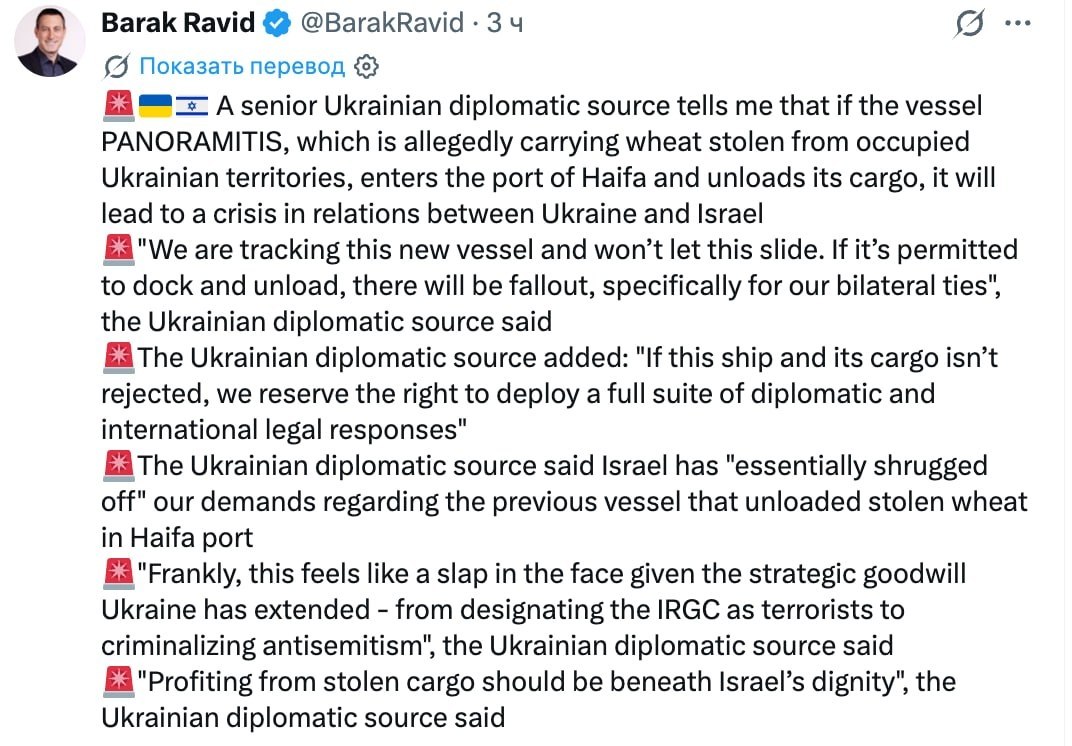 УКРАИНА УГРОЖАЕТ ДИПЛОМАТИЧЕСКИМИ МЕРАМИ В ОТНОШЕНИИ ИЗРАИЛЯ, ЕСЛИ КОРАБЛЬ "ПАНОРАМИТИС", ПОДОЗРЕВАЕМЫЙ В ТРАНСПОРТИРОВКЕ ЗЕРНА ИЗ "НОВЫХ РУССКИХ ТЕРРИТОРИЙ", ЗАЙДЁТ В ПОРТ ХАЙФА - журналист Axios Барак Равид