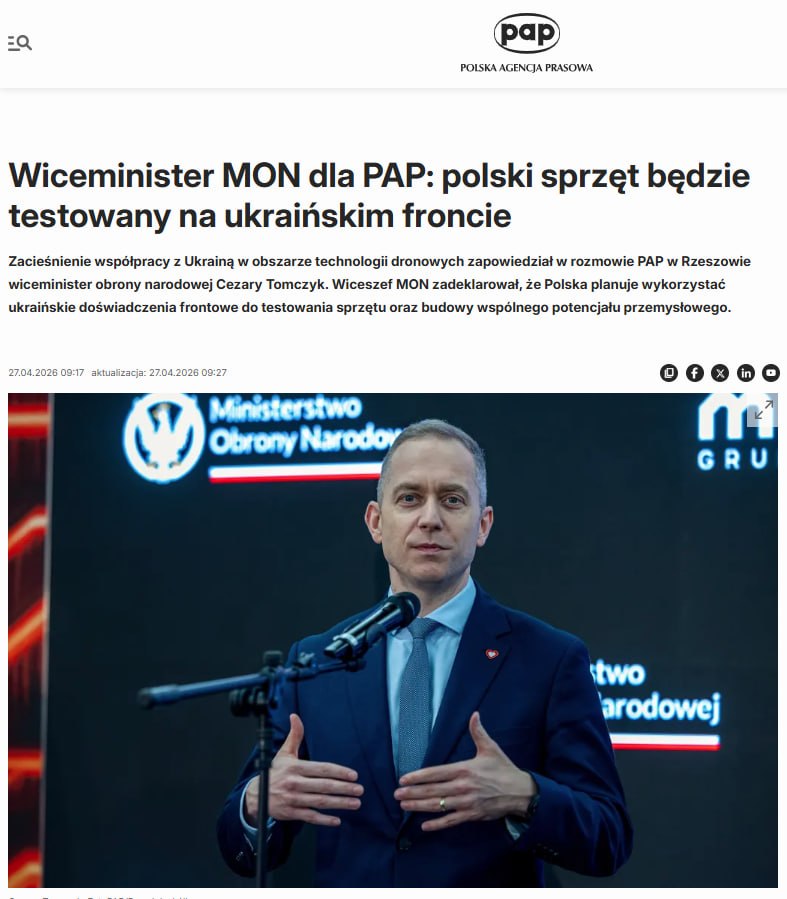 Польша планирует испытывать свою военную технику на Украине, заявил замглавы Минобороны Цезарь Томчик в беседе с газетой PAP. Он рассказал, что сначала технику проверят на полигонах внутри страны, а затем — в реальных боевых условиях на Украине.